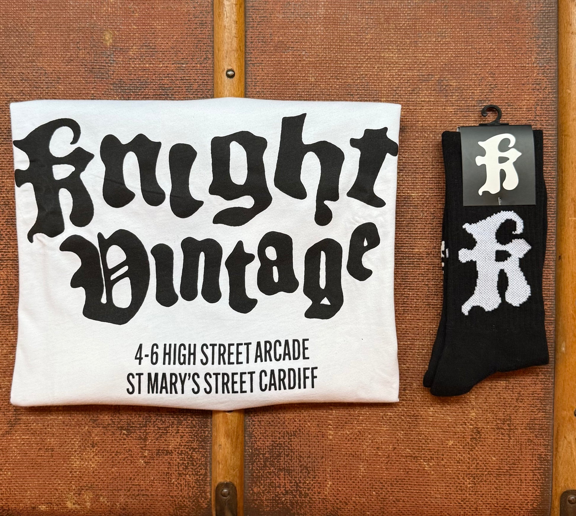 Includes a Knight Vintage "Address" T-shirt and pair of Black/White KV socks